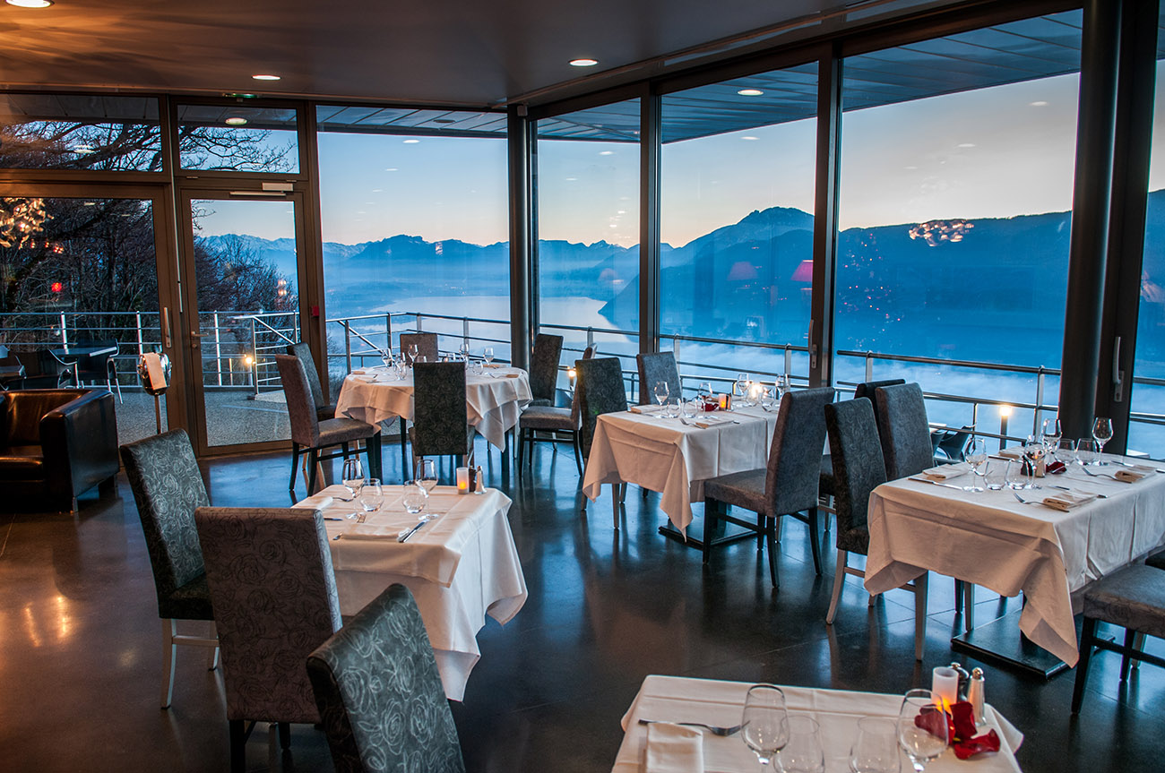 Vous voici face à ce paysage hypnotique. Sur la superbe terrasse, ou dans la salle aux grandes baies vitrées, Le Belvédère de La Chambotte vous délivre un propos culinaire soigné, personnel, ode aux produits régionaux. L’ambiance est chaleureuse et cosmopolite. La belle carte des vins vous invite à prolonger le plaisir.